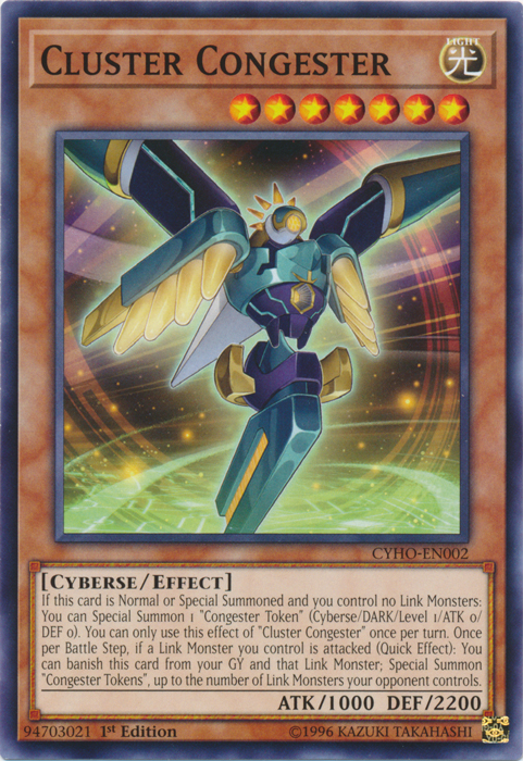If this card is Normal or Special Summoned and you control no Link Monsters: You can Special Summon 1 "Congester Token" (Cyberse/DARK/Level 1/ATK 0/DEF 0). You can only use this effect of "Cluster Congester" once per turn. Once per Battle Step, if a Link Monster you control is attacked (Quick Effect): You can banish this card from your GY and that Link Monster; Special Summon "Congester Tokens" up to the number of Link Monsters your opponent controls.