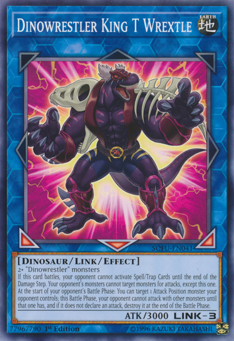 2+ "Dinowrestler" monsters If this card battles, your opponent cannot activate any Spell/Trap Cards until the end of the Damage Step.Your opponent's monsters cannot target monster for attacks, except this one. At the start of your opponent's Battle Phase: You can target 1 Attack Position monster your opponent controls; this Battle Phase, you opponent cannot attack with other monsters until this one has, and if does not declare an attck, destroy it at the end of the Battle Phase.