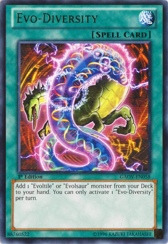Add 1 "Evoltile" or "Evolsaur" monster from your Deck to your hand. You can only activate 1 "Evo-Diversity" per turn.