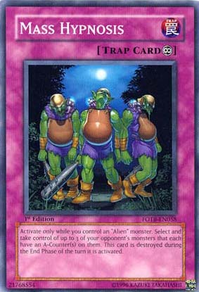 Activate only while you control an "Alien" monster. Select and take control of up to 3 of your opponent's monsters that each have an A-Counter(s) on them. This card is destroyed during the End Phase of the turn it is activated.