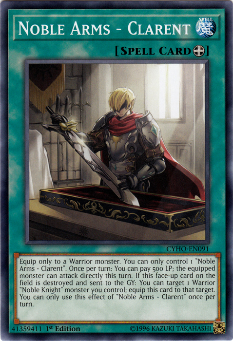 Equip only to a Warrior monster. You can only control 1 "Noble Arms - Clarent". Once per turn: You can pay 500 LP; the equipped monster can attack directly this turn. If this face-up card on the field is destroyed and sent to the GY: You can target 1 Warrior "Noble Knight" monster you control; equip this card to that target. You can only use this effect of "Noble Arms - Clarent" once per turn.