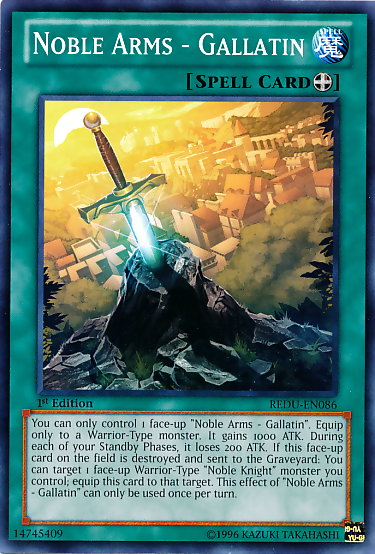 You can only control 1 face-up "Noble Arms - Gallatin". Equip only to a Warrior-Type monster. It gains 1000 ATK. During each of your Standby Phases, it loses 200 ATK. If this face-up card on the field is destroyed and sent to the Graveyard: You can target 1 face-up Warrior-Type "Noble Knight" monster you control, equip this card to that target. This effect of "Noble Arms - Gallatin" can only be used once per turn.