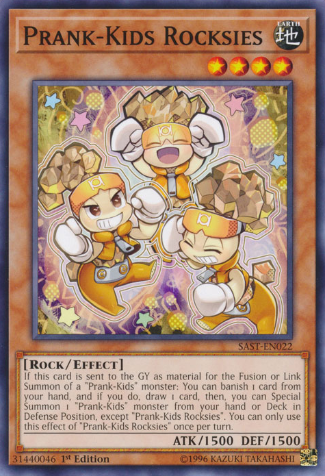 If this card is sent to the GY as material for the Fusion or Link Summon of a "Prank-Kids" monster: You can banish 1 card from your hand, and if you do, draw 1 card, then, you can Special Summon 1 "Prank-Kids" monster from your hand or Deck in Defense Position, except "Prank-Kids Rocksies". You can only use this effect of "Prank-Kids Rocksies" once per turn.