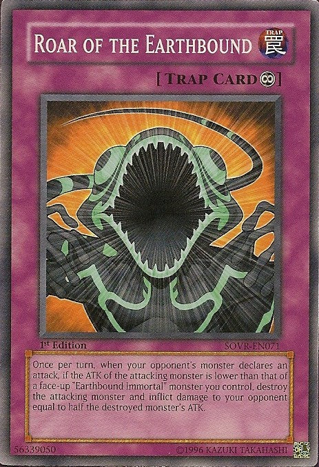 Once per turn, when your opponent's monster declares an attack, if the ATK of the attacking monster is lower than that of a face-up "Earthbound Immortal" monster you control, destroy the attacking monster and inflict damage to your opponent equal to half the destroyed monster's ATK.