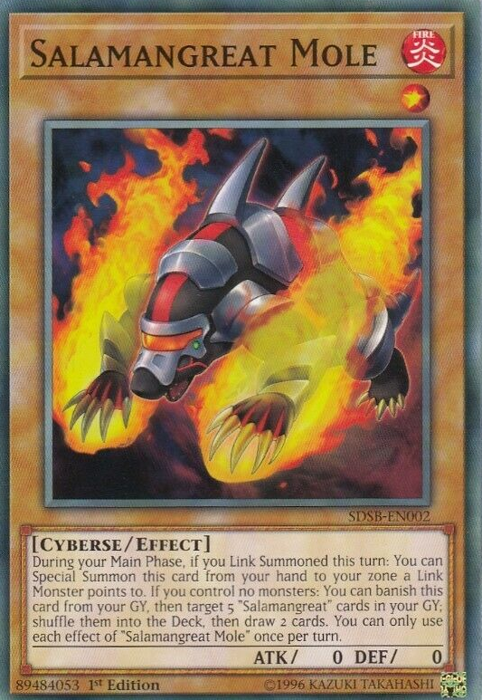 During your Main Phase, if you Link Summoned this turn: You can Special Summon this card from your hand to your zone a Link Monster points to. If you control no monsters: You can banish this card from your GY, then target 5 "Salamangreat" cards in your GY; shuffle them into the Deck, then draw 2 cards. You can only use each effect of "Salamangreat Mole" once per turn.
