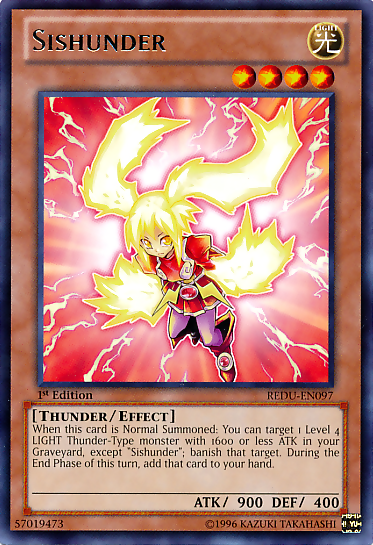 When this card is Normal Summoned: You can target 1 Level 4 LIGHT Thunder-Type monster with 1600 or less ATK in your Graveyard, except "Sishunder"; banish that target. During the End Phase of this turn, add that card to your hand.
