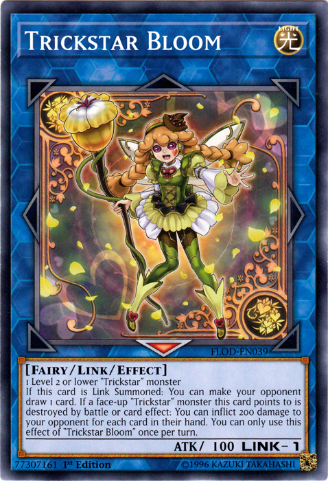 1 Level 2 or lower "Trickstar" monster If this card is Link Summoned: You can make your opponent draw 1 card. If a face-up "Trickstar" monster this card points to is destroyed by battle or card effect: You can inflict 200 damage to your opponent for each card in their hand. You can only use this effect of "Trickstar Bloom" once per turn.