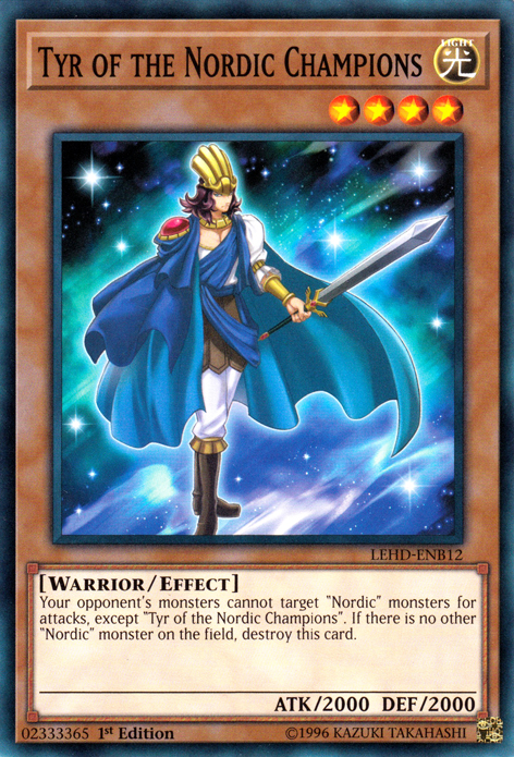 Your opponent's monsters cannot target "Nordic" monsters for attacks, except "Tyr of the Nordic Champions". If there is no other "Nordic" monster on the field, destroy this card.