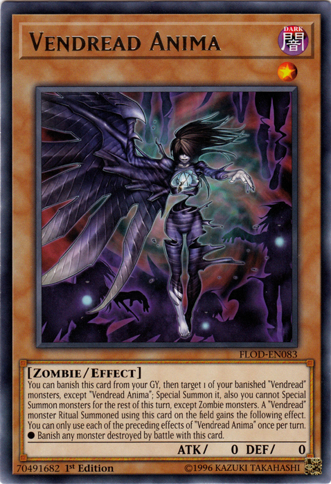 You can banish this card from your GY, then target 1 of your banished "Vendread" monsters, except "Vendread Anima"; Special Summon it, also you cannot Special Summon monsters for the rest of this turn, except Zombie monsters. A "Vendread" monster Ritual Summoned using this card on the field gains the following effect. You can only use each of the preceding effects of "Vendread Anima" once per turn. • Banish any monster destroyed by battle with this card.