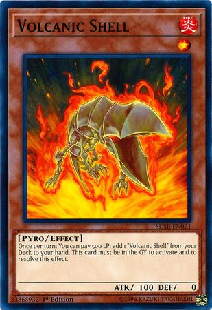 Once per turn: You can pay 500 LP; add 1 "Volcanic Shell" from your Deck to your hand. This card must be in the GY to activate and to resolve this effect.