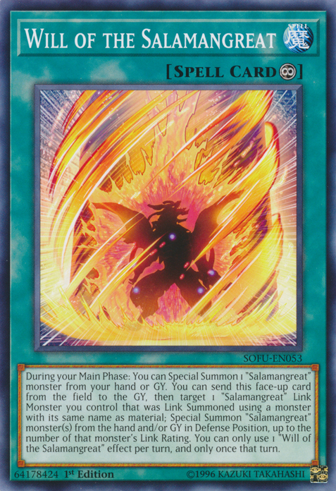 During your Main Phase: You can Special Summon 1 “Salamangreat” monster from your hand or GY. You can send this face-up card from the field to the GY, then target 1 “Salamangreat” Link Monster you control that was Link Summoned using a monster with the same name as itself as material; Special Summon “Salamangreat” monsters from your hand and/or GY in Defense Position, up to the number of that monster's Link Rating. You can only use 1 “Will of the Salamangreat” effect per turn, and only once that turn.