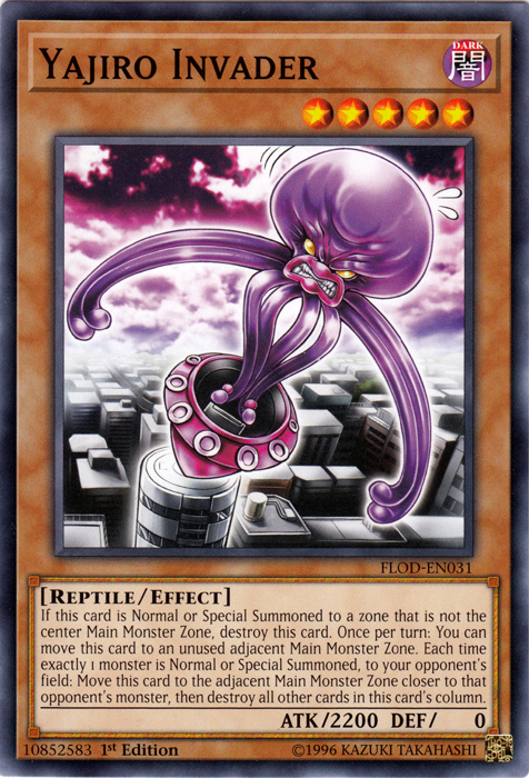 If this card is Normal or Special Summoned to a zone that is not the center Main Monster Zone, destroy this card. Once per turn: You can move this card to an adjacent Main Monster Zone. Each time exactly 1 monster is Normal or Special Summoned to your opponent's field: Move this card to the adjacent Main Monster Zone closer to that opponent's monster's, then destroy all other cards in this column.