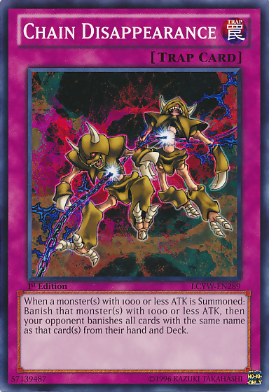 When a monster(s) with 1000 or less ATK is Summoned: Banish that monster(s), with 1000 or less ATK, then your opponent banishes all cards with the same name as that card(s) from their hand and Deck.