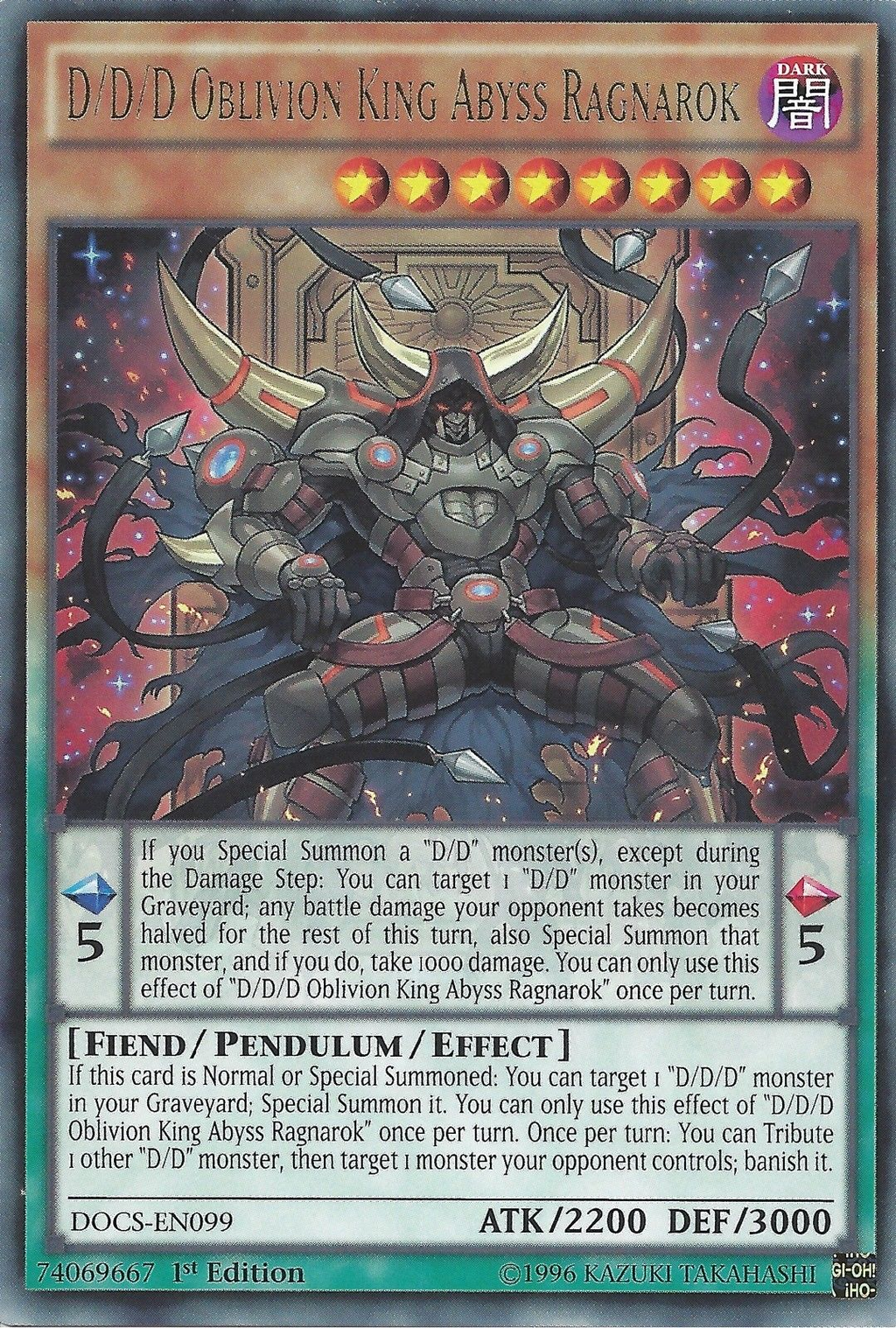 If this card is Normal or Special Summoned: You can target 1 "D/D/D" monster in your Graveyard; Special Summon it. You can only use this effect of "D/D/D Oblivion King Abyss Ragnarok" once per turn. Once per turn: You can Tribute 1 other "D/D" monster, then target 1 monster your opponent controls; banish it.