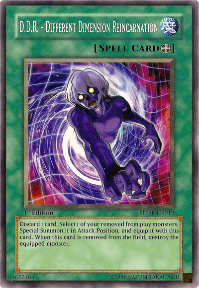 Discard 1 card. Select 1 of your removed from play monsters, Special Summon it in Attack Position, and equip it with this card. When this card is removed from the field, destroy the equipped monster.