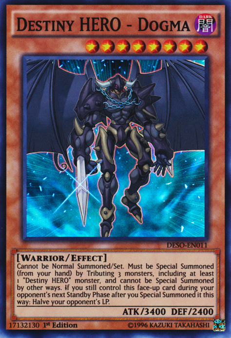 Cannot be Normal Summoned/Set. Must be Special Summoned (from your hand) by Tributing 3 monsters, including at least 1 "Destiny HERO" monster, and cannot be Special Summoned by other ways. If you still control this face-up card during your opponent's next Standby Phase after you Special Summoned it this way: Halve your opponent's LP.