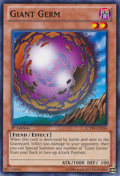 When this card is destroyed by battle and sent to the Graveyard, inflict 500 damage to your opponent, then you can also Special Summon any number of "Giant Germs" from your Deck in face-up Attack Position.