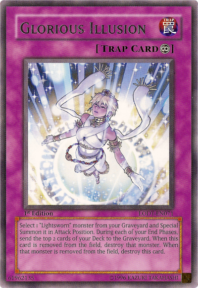Select 1 "Lightsworn" monster from your Graveyard and Special Summon it in Attack Position. During each of your End Phases, send the top 2 cards of your Deck to the Graveyard. When this card is removed from the field, destroy that monster. When that monster is removed from the field, destroy this card.