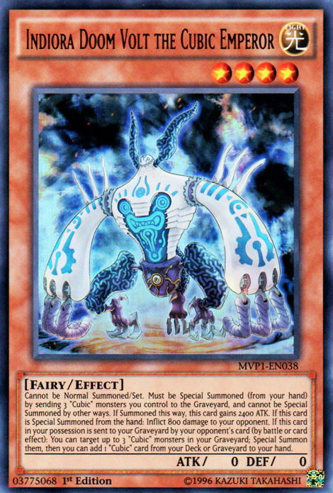 Cannot be Normal Summoned/Set. Must be Special Summoned (from your hand) by sending 3 "Cubic" monsters you control to the Graveyard, and cannot be Special Summoned by other ways. If Summoned this way, this card gains 2400 ATK. If this card is Special Summoned from the hand: Inflict 800 damage to your opponent. If this card in your possession is sent to your Graveyard by your opponent's card (by battle or card effect): You can target up to 3 "Cubic" monsters in your Graveyard; Special Summon them, then you can add 1 "Cubic" card from your Deck or Graveyard to your hand.