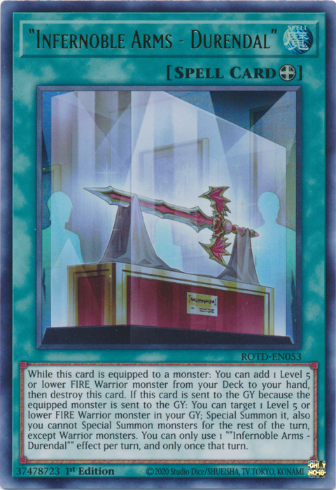 While this card is equipped to a monster: You can add 1 Level 5 or lower FIRE Warrior monster from your Deck to your hand, then destroy this card. If this card is sent to the GY because the equipped monster is sent to the GY: You can target 1 Level 5 or lower FIRE Warrior monster in your GY; Special Summon it, also you cannot Special Summon monsters for the rest of the turn, except Warrior monsters. You can only use 1 ""Infernoble Arms - Durendal"" effect per turn, and only once that turn.