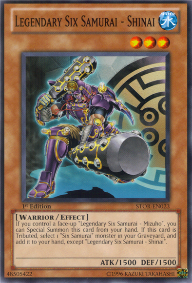 If you control a face-up "Legendary Six Samurai - Mizuho", you can Special Summon this card from your hand. If this card is Tributed, select 1 "Six Samurai" monster in your Graveyard, and add it to your hand, except "Legendary Six Samurai - Shinai".