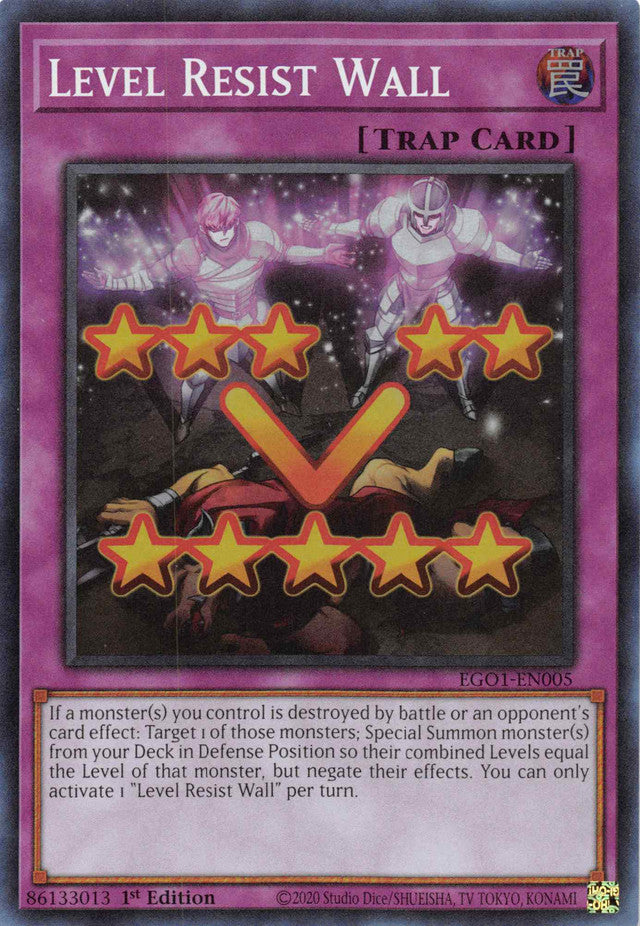 If a monster(s) you control is destroyed by battle or an opponent's card effect: Target 1 of those monsters; Special Summon monster(s) from your Deck in Defense Position so their combined Levels equal the Level of that monster, but negate their effects. You can only activate 1 "Level Resist Wall" per turn.