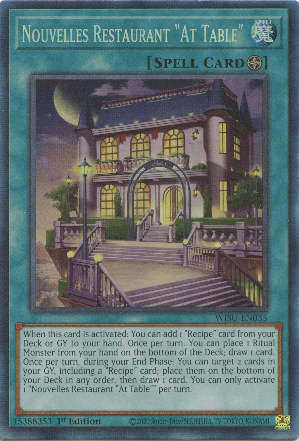 When this card is activated: You can add 1 "Recipe" card from your Deck or GY to your hand. Once per turn: You can place 1 Ritual Monster from your hand on the bottom of the Deck; draw 1 card. Once per turn, during your End Phase: You can target 2 cards in your GY, including a "Recipe" card; place them on the bottom of your Deck in any order, then draw 1 card. You can only activate 1 "Nouvelles Restaurant "At Table"" per turn.