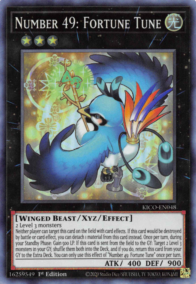 Neither player can target this card on the field with card effects. If this card would be destroyed by battle or card effect, you can detach 1 material from this card instead. Once per turn, during your Standby Phase: Gain 500 LP. If this card is sent from the field to the GY: Target 2 Level 3 monsters in your GY; shuffle them both into the Deck, and if you do, return this card from your GY to the Extra Deck. You can only use this effect of "Number 49: Fortune Tune" once per turn.