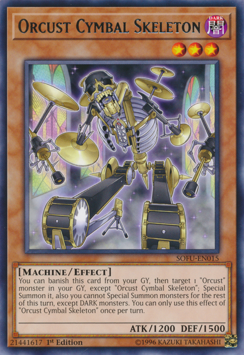 You can banish this card from your GY, then target 1 “Orcust” monster in your GY, except “Orcust Cymbal Skeleton”; Special Summon it, also you cannot Special Summon monsters for the rest of this turn, except DARK monsters. You can only use this effect of “Orcust Cymbal Skeleton” once per turn.