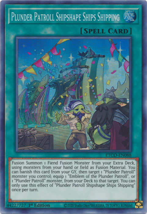 Fusion Summon 1 Fiend Fusion Monster from your Extra Deck, using monsters from your hand or field as Fusion Material. You can banish this card from your GY, then target 1 "Plunder Patroll" monster you control; equip 1 "Emblem of the Plunder Patroll", or 1 "Plunder Patroll" monster, from your Deck to that target. You can only use this effect of "Plunder Patroll Shipshape Ships Shipping" once per turn.