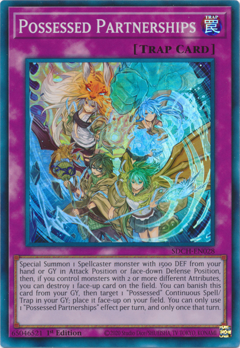 Special Summon 1 Spellcaster monster with 1500 DEF from your hand or GY in Attack Position or face-down Defense Position, then, if you control monsters with 2 or more different Attributes, you can destroy 1 face-up card on the field. You can banish this card from your GY, then target 1 "Possessed" Continuous Spell/Trap in your GY; place it face-up on your field. You can only use 1 "Possessed Partnerships" effect per turn, and only once that turn.