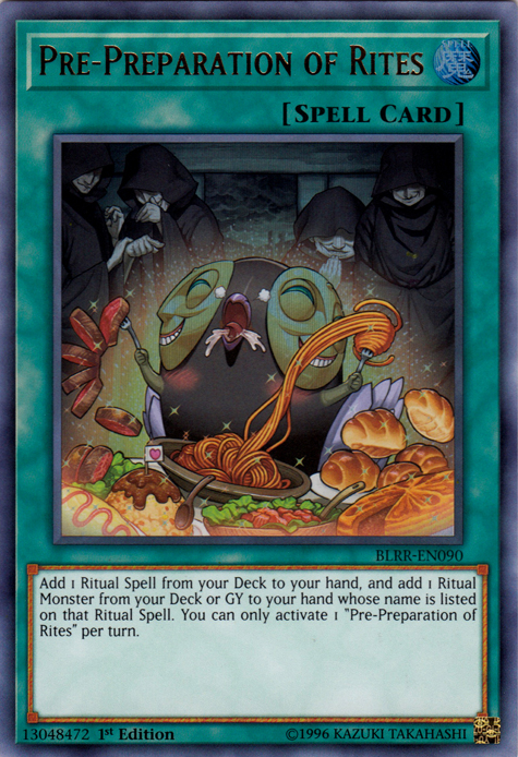 Add 1 Ritual Spell Card from your Deck to your hand, and add 1 Ritual Monster from your Deck or GY to your hand whose name is listed on that Ritual Spell Card. You can only activate 1 "Pre-Preparation of Rites" per turn.