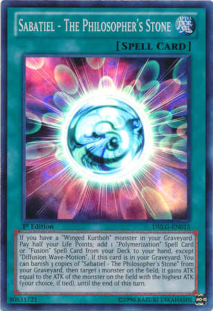 If you have a "Winged Kuriboh" monster in your Graveyard: Pay half your Life Points; add 1 "Polymerization" Spell Card or "Fusion" Spell Card from your Deck to your hand, except "Diffusion Wave-Motion". If this card is in your Graveyard: You can banish 3 copies of "Sabatiel - The Philosopher's Stone" from your Graveyard, then target 1 monster on the field; it gains ATK equal to the ATK of the monster on the field with the highest ATK (your choice, if tied), until the end of this turn.
