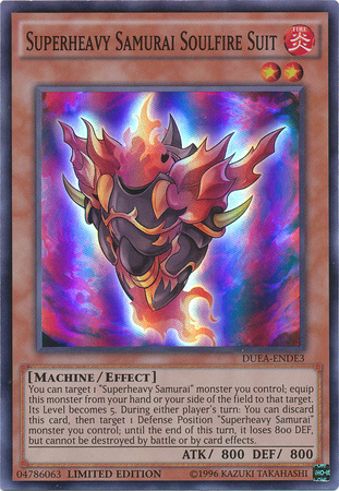 You can target 1 "Superheavy Samurai" monster you control; equip this monster from your hand or your side of the field to that target. Its Level becomes 5. During either player's turn: You can discard this card, then target 1 Defense Position "Superheavy Samurai" monster you control; until the end of this turn, it loses 800 DEF, but cannot be destroyed by battle or by card effects.