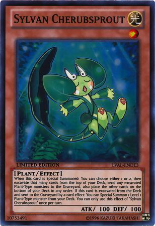 When this card is Special Summoned: You can choose either 1 or 2, then excavate that many cards from the top of your Deck, send any excavated Plant-Type monsters to the Graveyard, also place the other cards on the bottom of your Deck in any order. If this card is excavated from the Deck and sent to the Graveyard by a card effect: You can Special Summon 1 Level 1 Plant-Type monster from your Deck. You can only use this effect of "Sylvan Cherubsprout" once per turn.
