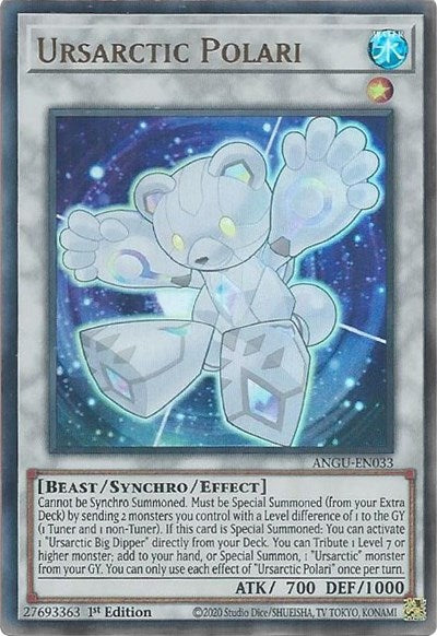 Cannot be Synchro Summoned. Must be Special Summoned (from your Extra Deck) by sending 2 monsters you control with a Level difference of 1 to the GY (1 Tuner and 1 non-Tuner). If this card is Special Summoned: You can activate 1 "Ursarctic Big Dipper" directly from your Deck. You can Tribute 1 Level 7 or higher monster; add to your hand, or Special Summon, 1 "Ursarctic" monster from your GY. You can only use each effect of "Ursarctic Polari" once per turn.