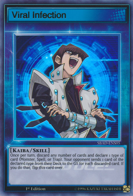 Once per turn, discard any number of cards and declare 1 type of card (Monster, Spell, or Trap). Your opponent sends 1 card of the declared type from their Deck to the GY for each discarded card. If you do that, flip this card over.