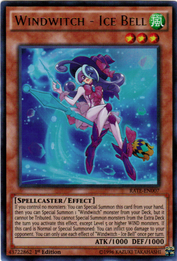 If you control no monsters: You can Special Summon this card from your hand, then you can Special Summon 1 "Windwitch" monster from your Deck, but it cannot be Tributed. You cannot Special Summon monsters from the Extra Deck the turn you activate this effect, except Level 5 or higher WIND monsters. If this card is Normal or Special Summoned: You can inflict 500 damage to your opponent. You can only use each effect of "Windwitch - Ice Bell" once per turn.
