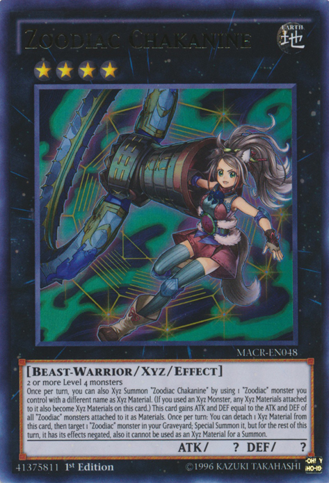 Once per turn, you can also Xyz Summon "Zoodiac Chakanine" by using 1 "Zoodiac" monster you control with a different name as Xyz Material. (If you used an Xyz Monster, any Xyz Materials attached to it also become Xyz Materials on this card.) This card gains ATK and DEF equal to the ATK and DEF of all "Zoodiac" monsters attached to it as Materials. Once per turn: You can detach 1 Xyz Material from this card, then target 1 "Zoodiac" monster in your Graveyard; Special Summon it, but for the rest of this turn, it has its effects negated, also it cannot be used as an Xyz Material for a Summon.