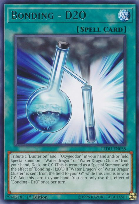Tribute 2 "Duoterion" and 1 "Oxygeddon" in your hand and/or field; Special Summon 1 "Water Dragon" or "Water Dragon Cluster" from your hand, Deck, or GY. (This is treated as a Special Summon with the effect of "Bonding - H2O".) If "Water Dragon" or "Water Dragon Cluster" is sent from the field to your GY while this card is in your GY: Add this card to your hand. You can only use this effect of "Bonding - D2O" once per turn.