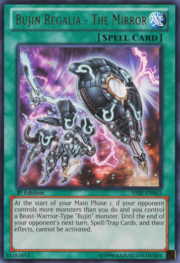 At the start of your Main Phase 1, if your opponent controls more monsters than you do and you control a Beast-Warrior-Type "Bujin" monster: Until the end of your opponent's next turn, Spell/Trap Cards, and their effects, cannot be activated.